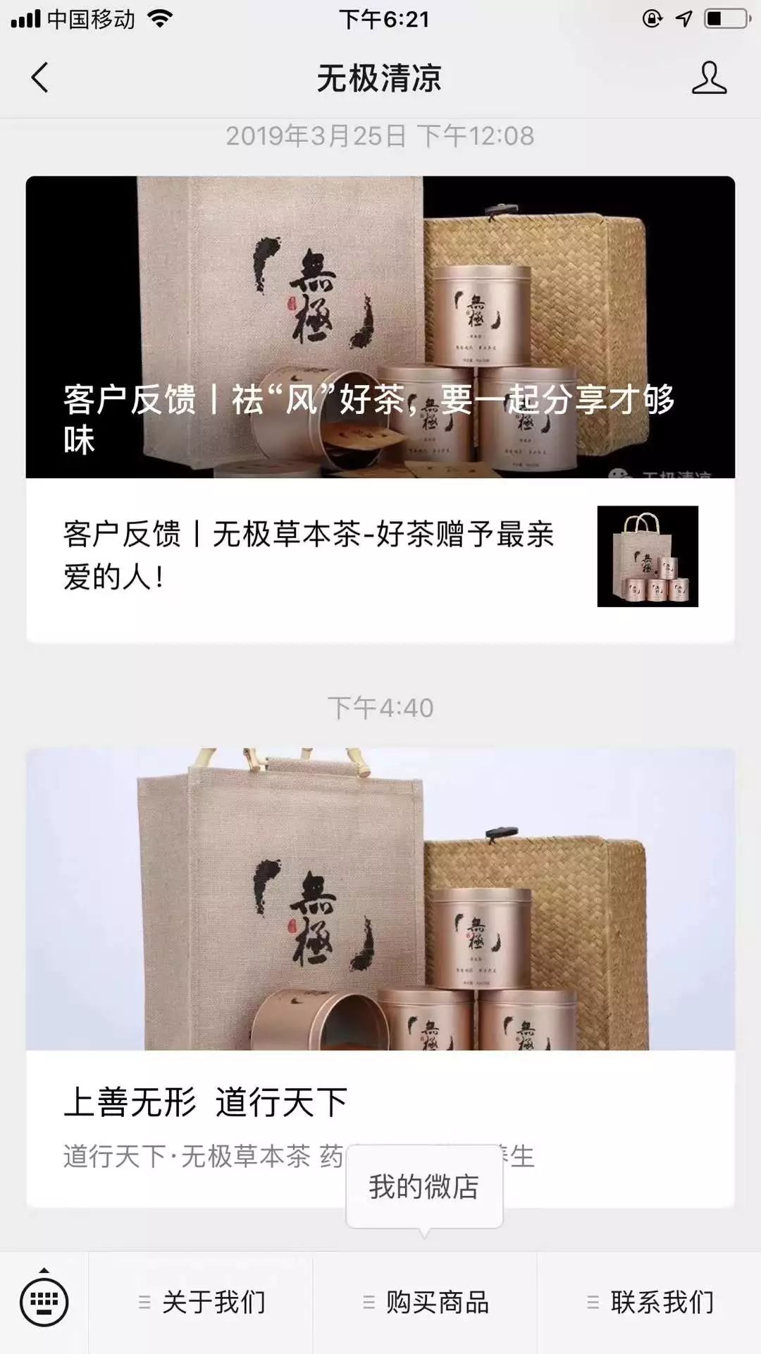 點(diǎn)開“無(wú)極清涼”微信公眾號(hào)聊天頁(yè)面,點(diǎn)擊左下角菜單目錄【關(guān)于我們】,選中【我的微店】